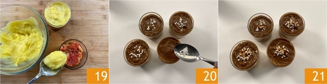 Terminez avec une couche de crème pâtissière classique 19 et une couche de celle au chocolat. Décorez avec des petits sucres 20 et des morceaux d'amandes. Placez au réfrigérateur jusqu'au moment de servir votre zuppa inglese à la colombe 21!