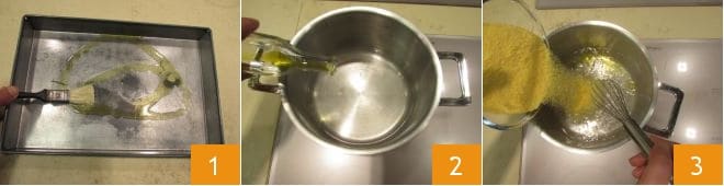 Pour préparer l'amuse-bouche de polenta et coquille Saint-Jacques, commencez immédiatement par verser 5 g d'huile dans un moule de 28x20 cm et réservez-le 1. Pendant ce temps, mettez une casserole d'eau sur le feu. Lorsque l'eau bout, salez et ajoutez environ 10 g d'huile 2, puis versez en pluie la farine instantanée pour polenta tout en mélangeant énergiquement avec un fouet (ou une cuillère en bois) pour éviter les grumeaux 3.