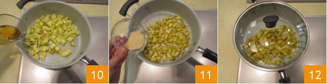 Assaisonnez de sel et de poivre et faites cuire à feu vif pendant 3-4 minutes, déglacez avec le brandy et laissez évaporer (faites très attention à une éventuelle flambée!) 10. Ajoutez le sucre de canne et laissez caraméliser pendant quelques minutes 11; à ce stade, les pommes seront prêtes, couvrez-les donc avec le couvercle et réservez-les 12.