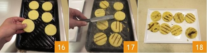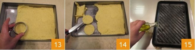 Reprenez la polenta et, à l'aide d'un emporte-pièce de 6,5 cm de diamètre 13, obtenez 8 disques 14. Chauffez un gril et arrosez-le de 10 g d'huile 15,
