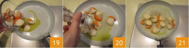 Pour finir, faites cuire également les coquilles Saint-Jacques. Faites chauffer une poêle avec le reste d'huile et ajoutez les mollusques en les laissant cuire 2 minutes de chaque côté à feu moyen-vif 19, assaisonnez de sel et de poivre blanc 20 et sautez souvent pour éviter qu'ils ne collent 21.
