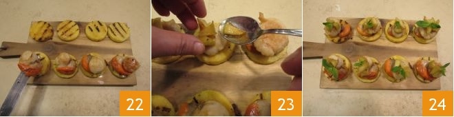 Enfin, passez à la composition: disposez les disques de polenta sur une planche, placez les coquilles Saint-Jacques 22 puis les pommes 23. Enfin, garnissez vos amuse-bouches de polenta avec des feuilles de menthe et vous êtes prêt à surprendre les invités 24!