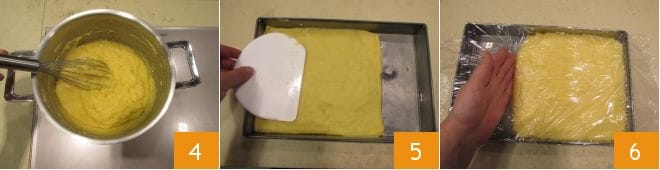 Continuez à mélanger continuellement pendant 8 minutes, afin d'obtenir une polenta consistante et sèche 4. Transférez ensuite la polenta sur le plateau et égalisez-la avec une spatule jusqu'à ce qu'elle atteigne une épaisseur de 0,5 cm, sans l'étendre sur toute la surface 5. Couvrez de film alimentaire et laissez refroidir au réfrigérateur pendant 20 minutes 6.