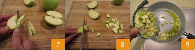 En attendant, occupez-vous des pommes. Coupez-les en 4 parts et retirez le trognon 7, découpez des morceaux d'environ deux centimètres et rassemblez-les dans un récipient 8. Dans une poêle, faites chauffer 20 g d'huile puis ajoutez les pommes 9.