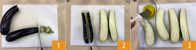 Pour préparer les barquettes d'aubergines grillées, chauffez le gril. Entre-temps, lavez et équeutez les aubergines 1. Coupez-les en deux dans le sens de la longueur 2 et badigeonnez-les d'huile d'olive extra vierge 3.