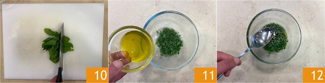 Hachez finement les feuilles de menthe 10, mettez-les dans un bol et assaisonnez avec de l'huile d'olive extra vierge 11, du sel et du vinaigre 12.