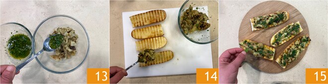 Avec ce mélange, vous pouvez assaisonner la pulpe d'aubergines 13. Maintenant, si vous le souhaitez, frottez les tranches de pain doré avec une gousse d'ail. Ensuite, répartissez la pulpe d'aubergines 14 et servez les barquettes d'aubergines grillées avec d'autres feuilles de menthe si vous le souhaitez 15.