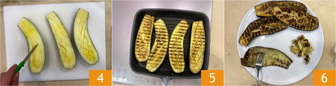 Pratiquez des incisions en quadrillage sur la pulpe 4. Placez-les sur le gril chaud côté pulpe et laissez cuire pendant 6-7 minutes, puis retournez-les et poursuivez la cuisson encore 6-7 minutes (la cuisson dépend de la taille des aubergines) 5. Une fois la cuisson terminée, mettez-les de côté et une fois refroidies, vous pourrez les vider de leur pulpe qui servira pour les bruschettas 6. Laissez le gril sur le feu, il servira pour le pain.