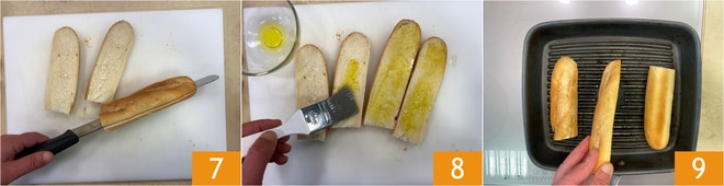 Coupez les baguettes en deux ou en plusieurs parties si elles sont très longues, puis ouvrez-les 7, badigeonnez-les d'huile 8 et grillez-les également pour les faire dorer 9.