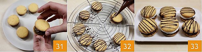 Maintenant, posez sur chaque moitié garnie les autres biscuits restants pour créer vos bisous 31. Ensuite, transférez-les sur une grille et terminez-les avec du chocolat fondu en réalisant de petites rayures décoratives sur chaque bisou en vous aidant avec un cornet en papier 32. Pour réaliser un cornet en papier, vous pouvez consulter la fiche de l'école de cuisine : comment faire un cornet avec du papier sulfurisé. Si vous le souhaitez, vous pouvez monter un peu de crème fraîche liquide avec du sucre glace et garnir vos bisous avec la crème fouettée, en plus de la crème au café, pour les rendre encore plus moelleux et savoureux 33 !