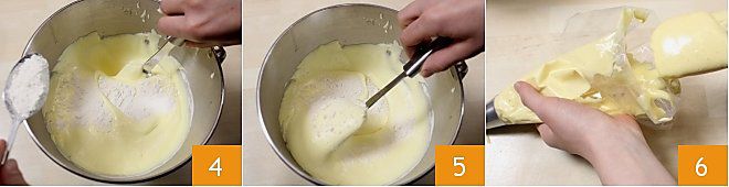 Ensuite, retirez les fouets et ajoutez petit à petit la farine et la levure à la crème 4, en mélangeant avec une spatule pour bien incorporer le tout. Prenez une poche à douille avec une douille simple et versez la crème à l'intérieur en vous aidant avec la spatule 6.