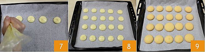 Recouvrez une plaque de cuisson d'une feuille de papier sulfurisé et commencez à distribuer la crème avec la poche à douille pour créer des disques de pâte d'environ 3 cm de diamètre 7, en essayant de les espacer de quelques centimètres 8. Enfournez dans un four statique préchauffé à 190° pendant au moins 12 minutes (si four ventilé à 170° pendant environ 6 minutes) ou jusqu'à ce que les petits disques soient légèrement gonflés et commencent à dorer légèrement sur les bords. Ensuite, sortez la plaque du four et laissez tiédir les petits biscuits obtenus 9.