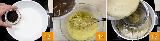 Mettez de côté la crème obtenue ; en attendant, dans une grande casserole, versez le lait. Allumez le feu doux et laissez chauffer en ajoutant le café en poudre et mélangez pour qu'il se dissolve 13. Faites frôler l'ébullition, puis éteignez le feu 13. Ensuite, versez le lait et le café obtenu dans la crème que vous aviez mise de côté 14 et mélangez avec le fouet pour bien amalgamer le tout. Ensuite, transférez ce mélange dans la même casserole où vous aviez chauffé le lait, en le filtrant avec un tamis 15. Remuez et allumez le feu pour épaissir la crème. Ensuite, éteignez et mettez de côté.