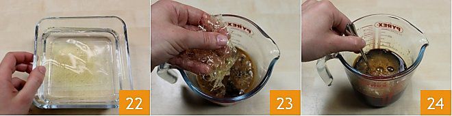 Maintenant, mettez la gélatine à tremper dans de l'eau froide pendant 10 minutes 22. Une fois le temps écoulé, essorez-la et ajoutez-la au café fraîchement préparé pour qu'elle fonde, en remuant avec une cuillère (23-24).