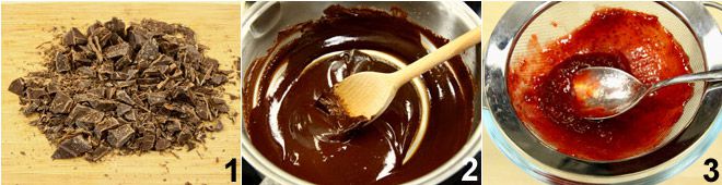 Pour préparer le banana split, commencez par préparer les deux nappages : pour celui au chocolat, hachez le chocolat noir avec un couteau 1, faites-le fondre au bain-marie et ajoutez environ 30 ml de crème chauffée dans une petite casserole en remuant continuellement 2. Passez au tamis 2 cuillères à soupe de confiture de fraises 3 pour éliminer les pépins et obtenir ainsi une purée. Montez la crème fraîche restante.