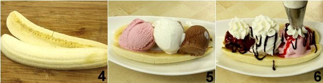 Coupez en deux une banane dans le sens de la longueur 4 et disposez-la sur une assiette ovale ou en forme de "barquette", puis placez une boule de glace à la fraise, une de glace à la vanille et une de glace au chocolat 5. Ensuite, décorez avec les nappages de fraise et de chocolat à votre goût et avec la crème chantilly 6. Garnissez enfin le banana split avec du praliné de noisettes, des copeaux de chocolat et des cerises confites.