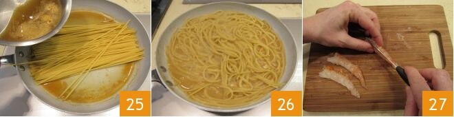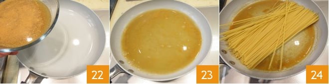 Entre-temps, faites chauffer dans une grande poêle une partie du fumet (22-23), ajoutez les bavettes 24 (qui doivent pouvoir être facilement allongées et que vous devez pouvoir mélanger aisément).