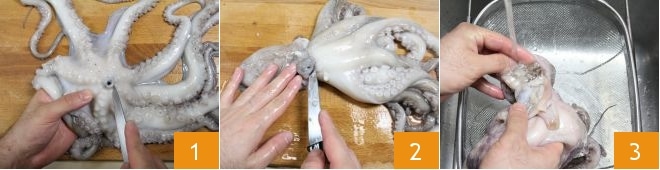 Pour préparer les bavettes avec poulpe et crevettes, commencez par cuire le poulpe. Mettez sur le feu, une grande casserole pleine d'eau salée et portez à ébullition. Entre-temps, Comment nettoyer et cuire le poulpe, en retournant et vidant la tête, en enlevant la dent située au centre des tentacules avec un petit couteau 1 et en supprimant les yeux 2; rincez-le très bien sous l'eau froide courante 3.