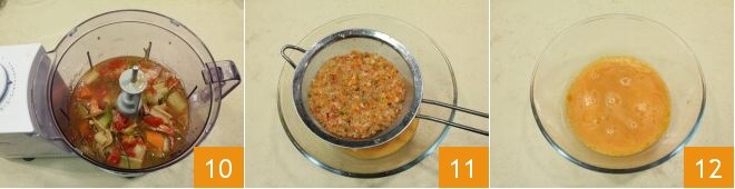 Laissez cuire à feu doux jusqu'à réduire le liquide de moitié, puis mixez le tout 10 et filtrez avec un tamis fin 11. Vous avez obtenu votre fumet de crustacés 12.