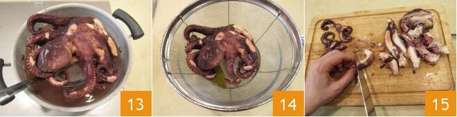 Une fois cuit, laissez tiédir le poulpe dans son eau de cuisson, puis égouttez-le (13-14) et coupez-le en morceaux 15.