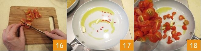 Coupez également les tomates cerises en quatre 16. Dans une poêle, faites revenir l'ail et le piment épépiné et coupé en lamelles, avec l'huile d'olive extra vierge 17, puis ajoutez les tomates cerises et le sel 18;