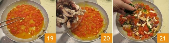 laissez cuire pendant environ 10 minutes, puis éteignez le feu, retirez l'ail 19, ajoutez le poulpe 20 et le persil finement haché 21.