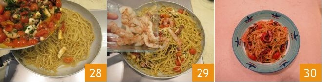 Lorsque vos bavettes sont presque cuites, ajoutez la sauce aux tomates cerises et au poulpe 28, les crevettes 29 (si elles sont plus petites, vous pouvez également les laisser entières), le persil haché et le poivre moulu. Terminez la cuisson et servez vos bavettes avec poulpe et crevettes encore chaudes 30.
