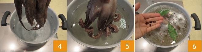 Dès que l'eau commencera à bouillir, plongez et retirez les tentacules plusieurs fois jusqu'à ce qu'ils s'enroulent (4-5) (ils seront beaucoup plus beaux à voir une fois dressés) puis plongez enfin tout le poulpe. Ajoutez également dans l'eau les arômes : le laurier, les baies de genièvre, la gousse d'ail légèrement écrasée et le poivre rose en grains 6. Couvrez la casserole avec le couvercle, baissez le feu au minimum (l'eau doit juste frémir) et laissez cuire ainsi pendant 40 minutes.