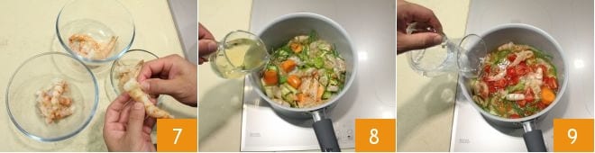 Couvrez à peine avec le fumet bouillant 25. Remuez continuellement pour éviter qu'elles ne collent, ajoutez peu à peu le fumet chaud jusqu'à ce qu'elles soient cuites 3 minutes avant la fin de la cuisson 26 (si vous finissez le fumet avant la fin de la cuisson des pâtes, vous pouvez utiliser de l'eau chaude ou du bouillon de légumes léger). Entre-temps, coupez les crevettes en deux dans le sens de la longueur 27 (si elles sont plus petites, vous pouvez également les laisser entières).