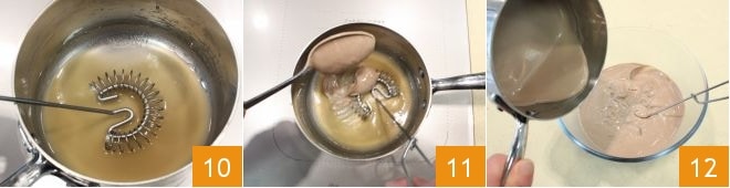 Procédez avec la crème au chocolat en suivant le même procédé : mettez sur le feu une petite casserole et chauffez à feu doux 50 ml d'eau, puis versez 5 g d'agar-agar et mélangez pour le dissoudre 10 et faites épaissir le mélange toujours à feu doux. Lorsqu’il est épais, éteignez le feu, délayez une cuillère de crème foncée 11, versez tout le mélange d'agar-agar dans la crème 12