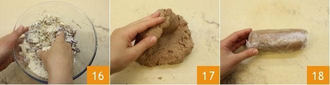 pétrissez à la main pour rassembler tous les ingrédients 16, lorsque vous aurez obtenu un mélange compact, transférez-le sur un plan de travail 17, donnez-lui la forme d'un pain, enveloppez-le dans du film plastique 18 et laissez-le reposer au réfrigérateur pendant environ 30 minutes, jusqu'à ce qu'il soit bien ferme.