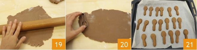 Après ce temps, étalez la pâte avec le rouleau à pâtisserie sur le plan de travail légèrement fariné, en créant une feuille d'environ un demi-centimètre d'épaisseur 19. Découpez maintenant la pâte avec un emporte-pièce en forme de cuillère 20. Répartissez les biscuits sur une plaque recouverte de papier sulfurisé et faites cuire les biscuits dans un four préchauffé statique à 170° pendant 15 minutes (ou dans un four ventilé à 160° pendant 10 minutes). Une fois la cuisson terminée, sortez les biscuits du four et laissez-les refroidir 21.