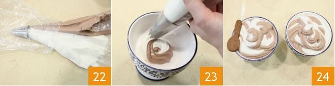Une fois que les crèmes se sont raffermies, vous pouvez composer le dessert : transférez les crèmes dans deux poches à douille avec des embouts étoilés 22 et répartissez les crèmes dans les verrines en les alternant 23, accompagnez chaque verrine au yaourt et chocolat avec les biscuits en forme de cuillère 24.