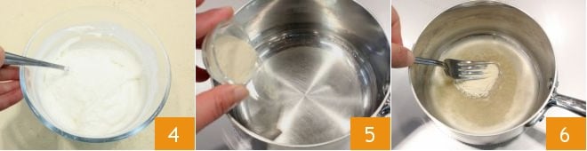 et les graines d'une gousse de vanille, mélangez pour obtenir une crème homogène 4. Mettez sur le feu une petite casserole et chauffez à feu doux 50 ml d'eau, puis versez 5 g d'agar-agar 5, mélangez pour le dissoudre 6 et faites épaissir le mélange toujours à feu doux.