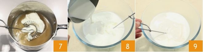Lorsque le mélange est épais, éteignez le feu, délayez une cuillère de crème claire dans la casserole 7, mélangez et versez ensuite tout le mélange d'agar-agar dans la crème 8, mélangez pour amalgamer 9, puis couvrez avec du film plastique et laissez raffermir au réfrigérateur pendant 1 heure.