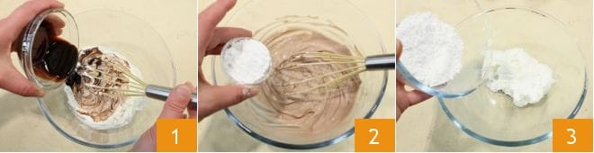 Pour réaliser la verrine au yaourt et chocolat, prenez le yaourt et divisez-le en deux dans deux bols séparés. Dans un bol, versez la Panna cotta à la noix de coco avec sauce au chocolat 1 et 30 g de sucre glace 2, mélangez avec une spatule pour amalgamer, vous obtiendrez une crème foncée. Dans l’autre bol avec le yaourt, ajoutez 100 g de sucre glace 3
