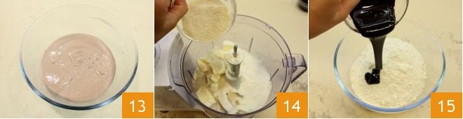 mélangez pour amalgamer 13, puis couvrez avec du film plastique et laissez raffermir au réfrigérateur pendant 1 heure. Pendant ce temps, préparez les biscuits : dans un mixeur, mettez la farine tamisée, le beurre froid en morceaux, une pincée de sel et le sucre de canne 14. Actionnez les lames pour quelques instants, juste le temps d'obtenir une pâte sableuse, transférez-la dans un bol et versez la sauce au chocolat 15,