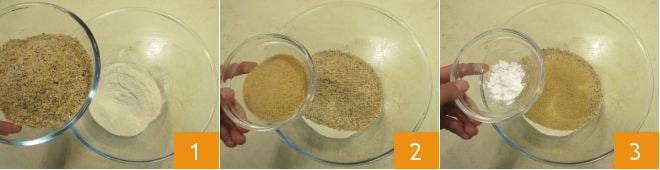 Pour préparer les biscuits au teff, commencez par verser le lait dans une petite casserole et chauffez-le sans le faire bouillir. Pendant ce temps, mélangez dans un bol la farine de teff, la farine de noisettes 1, le sucre de canne 2 et la levure chimique 3.