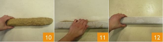 Une fois le temps de repos écoulé, reprenez la pâte et façonnez-la en un boudin d'environ 30 cm de long 10. Enveloppez le boudin dans une feuille de papier sulfurisé 11, en aplatissant les bords sur le plan de travail au fur et à mesure que vous l'enroulez pour lui donner une forme carrée 12. Mettez l'enveloppe au congélateur pour raffermir pendant environ 20 minutes.
