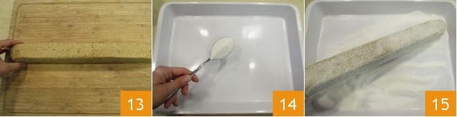 Après le temps de refroidissement, retirez le papier sulfurisé 13 et saupoudrez un plateau de sucre en poudre 14, puis passez le boudin dans le sucre jusqu'à ce que les côtés soient uniformément recouverts 15.