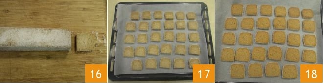 À ce stade, coupez-le en tranches d'une épaisseur de 1 cm 16 et placez les carrés obtenus sur une plaque recouverte de papier sulfurisé 17. Avec ces doses, vous obtiendrez environ 35 biscuits. Faites cuire les biscuits dans un four statique préchauffé à 170° pendant environ 30-35 minutes en les plaçant sur la grille du milieu. Lorsqu'ils sont uniformément dorés 18, retirez-les du four et laissez-les tiédir : vos biscuits au teff seront prêts à être dégustés !
