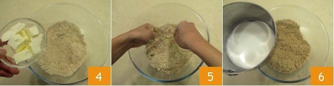 Ajoutez le beurre en morceaux, froid du réfrigérateur 4, et émiettez-le dans le mélange du bout des doigts 5. À ce stade, versez le lait chaud 6 et mélangez brièvement pour délayer le mélange.