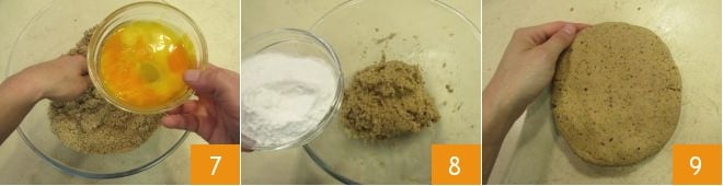 Ajoutez les œufs battus 7 et pétrissez à la main pour les incorporer au reste des ingrédients. Avant que le mélange ne soit complètement homogène, ajoutez également la farine de riz 8 et terminez de pétrir jusqu'à obtenir une pâte d'une consistance uniforme 9. Enveloppez la pâte dans du film plastique et laissez-la reposer au réfrigérateur pendant au moins 30 minutes.