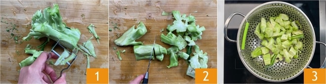 Pour réaliser les bruschettas à la crème de brocoli, commencez par peler la tige du brocoli avec un économe pour enlever la partie extérieure la plus coriace 1, puis coupez-la grossièrement 2. Coupez également les feuilles en morceaux, si elles sont présentes. Faites cuire les tiges et les feuilles à la vapeur pendant 10 minutes 3.