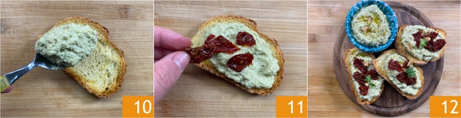 Étalez la crème de brocoli sur les tranches de pain grillé 10 et garnissez selon vos goûts avec des tomates séchées 11 ou des anchois. Vos bruschettas à la crème de brocoli sont prêtes à être dégustées 12!