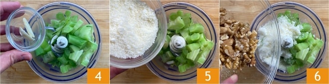 Transférez le tout dans un mixeur et ajoutez la gousse d'ail dégermée 4, le Pecorino râpé 5 et les cerneaux de noix 6.