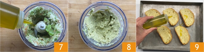 Mixez pendant quelques secondes, puis ajoutez l'huile peu à peu 7 et continuez à mixer jusqu'à obtenir une consistance crémeuse et homogène 8. Ajustez la crème de brocoli en sel et poivre. À ce stade, coupez le pain en tranches, assaisonnez avec de l'huile 9 et du poivre et toastez dans le four chaud pendant quelques minutes.