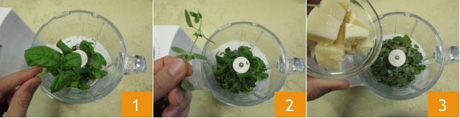 Pour préparer les bruschettes au pesto d'herbes et sardines grillées, commencez par préparer le pesto rapide. Dans le mixeur, versez les feuilles de basilic 1, quelques feuilles de mélisse et quelques-unes d'origan 2, puis du sel, du poivre et le parmesan en morceaux 3