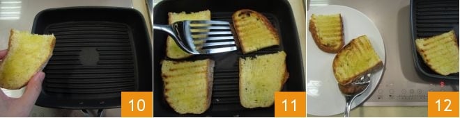 et faites cuire sur un gril bien chaud 10. Il faudra environ une paire de minutes, après quoi vous pourrez retourner les tranches et cuire encore de l'autre côté 11. Une fois prêtes, mettez les tranches de pain dans une assiette et gardez le gril au chaud 12.