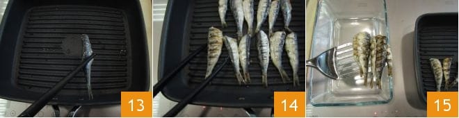 Reprenez les sardines assaisonnées et disposez-les sur le gril encore chaud 13. Faites-les cuire également pendant une paire de minutes de chaque côté, en les retournant lorsque la peau aura tendance à se détacher du gril 14. Une fois cuites, transférez-les également dans un récipient 15.